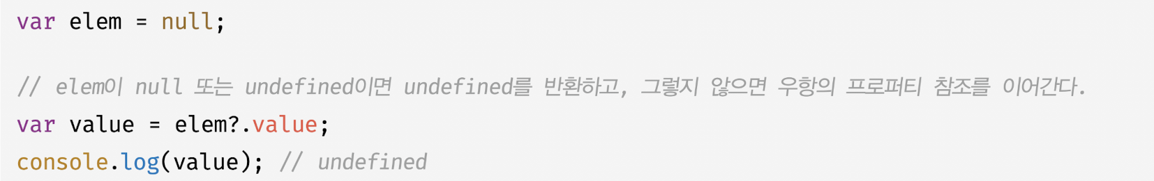 - ES11 옵셔널 체이닝 연산자(?) : 좌항의 피연산자가 null, undefined인 경우 undefined 반환, 그렇지 않으면 우항의 프로퍼티 참조