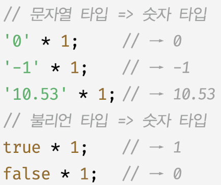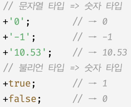 - 개발자의 의도와 상관없이 표현식을 평가하는 도주엥 자바스크립트 엔진에 의해 암묵적으로 타입이 자동 변환되는 경우