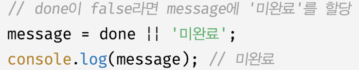- 어떤 조건이 falsy 값일 때 무언가를 해야한다면 논리합 연산자 표현식으로 if 문 대체 가능