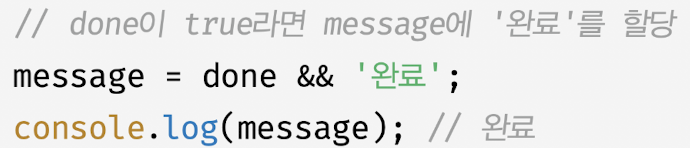- 어떤 조건이 truthy 값일 때 무언가를 해야한다면 논리곱 연산자 표현식으로 if 문 대체 가능