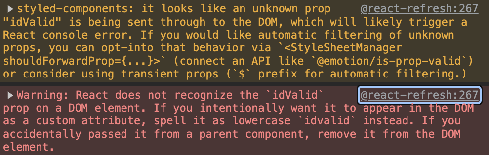 idValid라는 props를 스타일 컴포넌트로 보내주고 있었는데 이 부분이 dom입장에서는 속성처럼 받아들일 수 있다는 경고였다. 그래서 이 경고를 해결하는 방법은 props 앞에 달러 기호를 붙여주는 것이다.