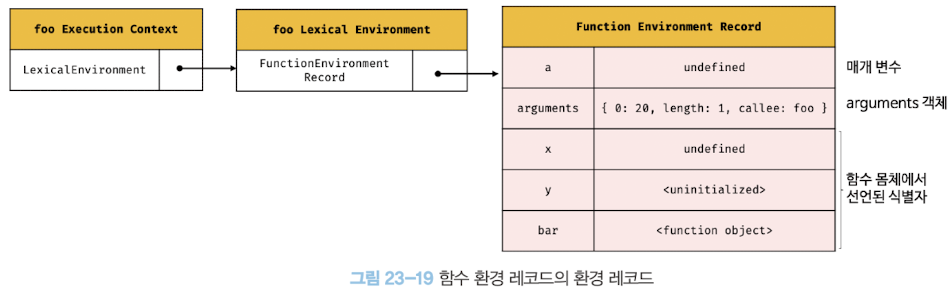 - 함수 환경 레코드는 매개변수, arguments 객체, 함수 내부에서 선언한 지역 변수와 중첩함수 등록 & 관리