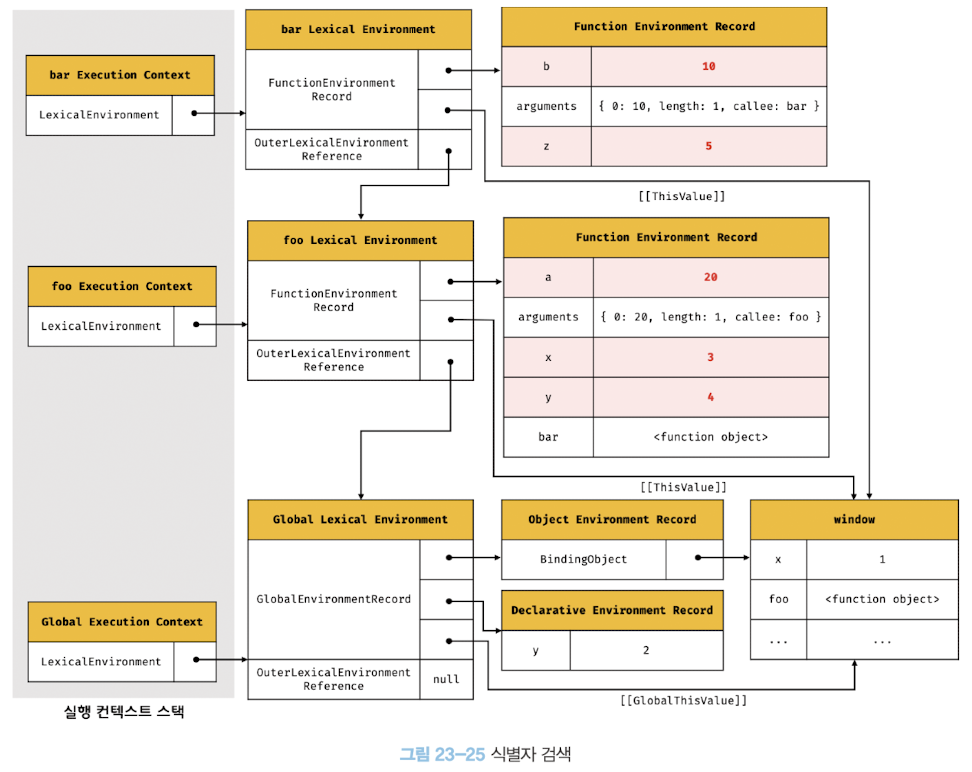 - a 식별자는 foo 함수 렉시컬 환경, b와 z 식별자는 bar 함수 렉시컬 환경, x와 y foo 함수 렉시컬 환경에서 검색