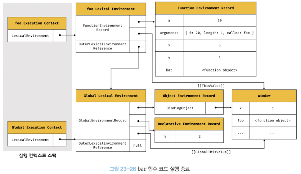 - 실행컨텍스트 스택에서 bar 함수 실행 컨텍스트가 팝되어 제거