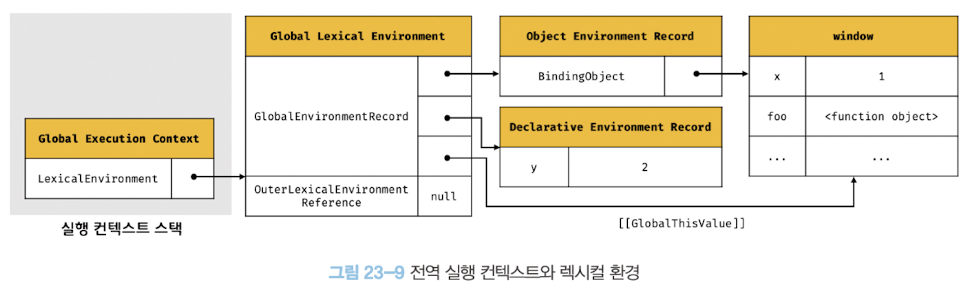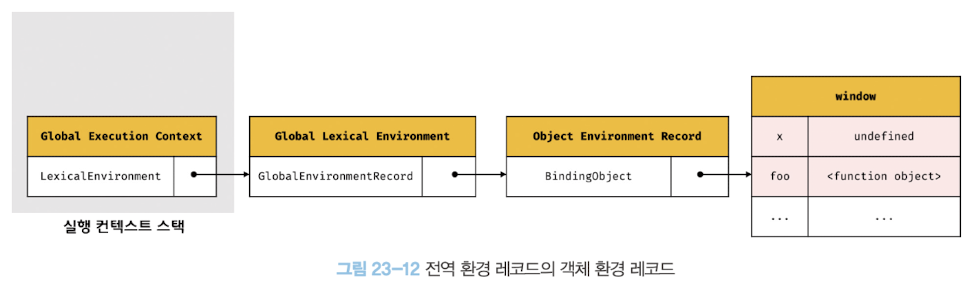 - 전역 변수 x와 전역 함수 foo는 객체 환경 레코드 통해 객체 환경 레코드의 BindingObject에 바인딩되어 있는 전역 객체의 프로퍼티와 메서드가 됨