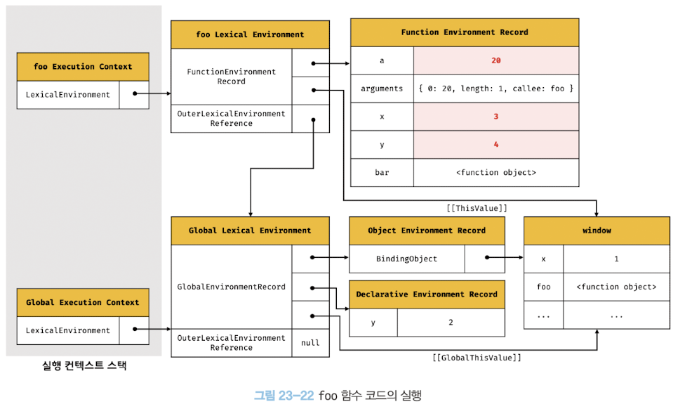 - foo 함수 렉시컬 환경에서 식별자 x, y 검색 -> 검색된 식별자에 값 바인딩