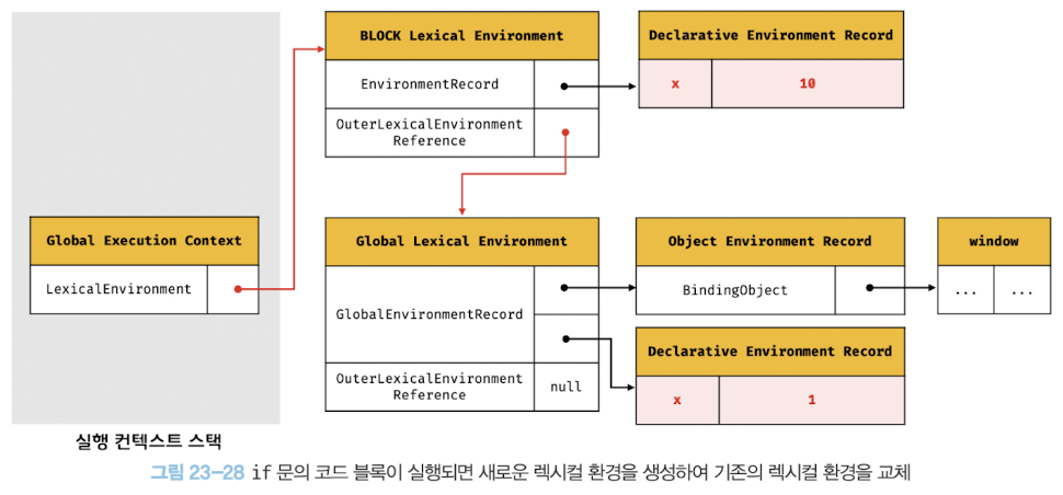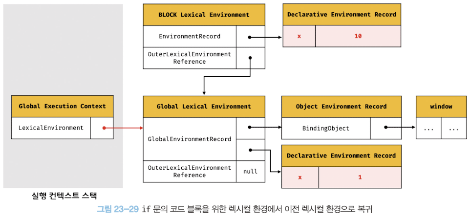 - if 문 코드 블록의 실행 종료되면 if 문의 코드 블록이 실행되기 이전의 렉시컬 환경으로 되돌림
