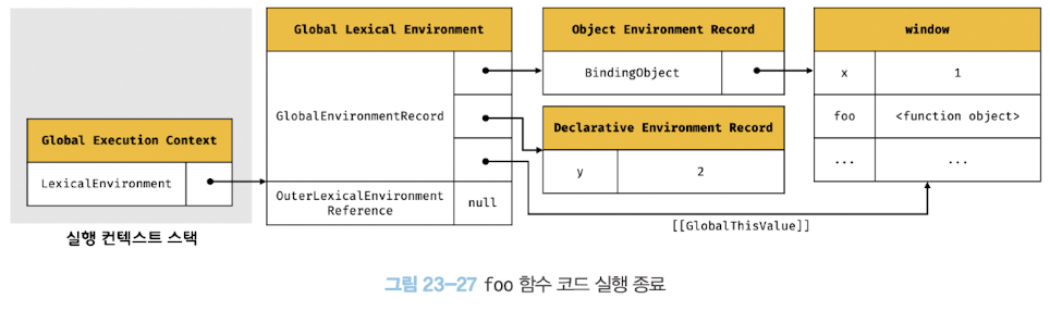 - 외부 렉시컬 환경에 대한 참조에 foo 함수 정의가 평가된 시점에 실행중인 실행 컨텍스트의 렉시컬 환경의 참조 할당