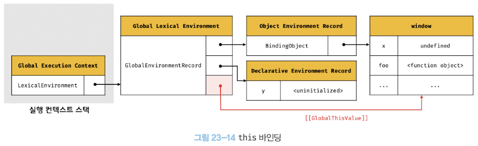 - 전역 환경 레코드 중 객체 환경 레코드, 선언적 환경 레코드는 this 바인딩 없음