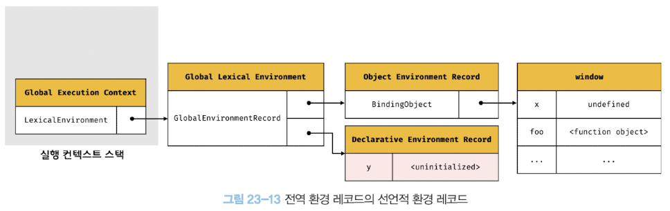 - 선언된 식별자는 실행 컨텍스트의 렉시컬 환경의 환경 레코드에 등록되어있음