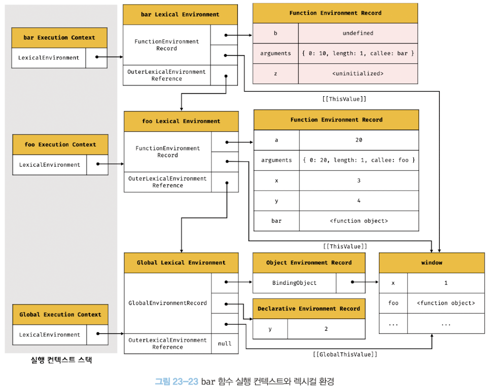 - a 식별자는 foo 함수 렉시컬 환경, b와 z 식별자는 bar 함수 렉시컬 환경, x와 y foo 함수 렉시컬 환경에서 검색