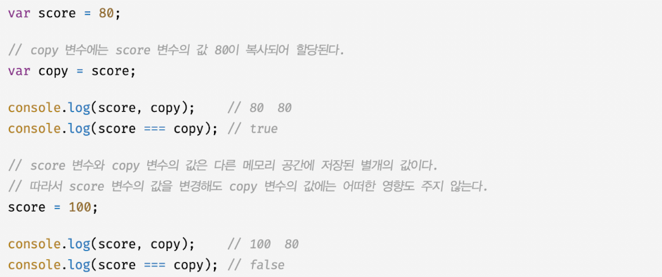 - 값에 의한 전달 : 변수에 원시값을 갖는 변수를 할당하면 할당받는 변수에는 할당되는 변수의 원시값이 복사되어 전달되는 것