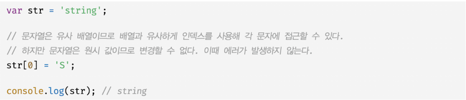 - 이미 생성된 문자열의 일부 문자를 변경하려는 코드에도 에러가 없지만 읽기 전용 값이기 때문에 변경 불가능
