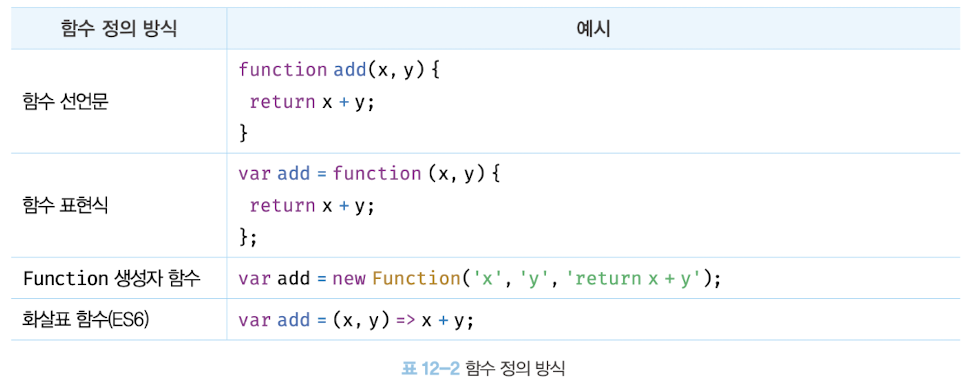 - 함수 표현식 : 함수 리터럴로 생성한 함수 객체를 변수에 할당 가능한 정의 방식