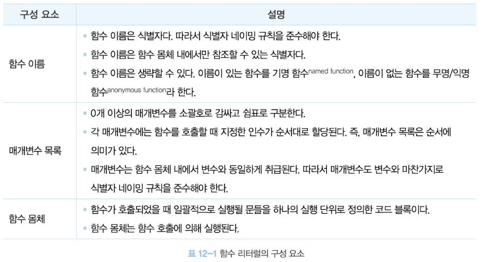 - 함수 리터럴은 function 키워드, 함수 이름, 매개 변수 목록, 함수 몸체로 구성