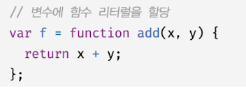 - 변수에 할당 가능, 프로퍼티 값 될 수 있음, 배열의 요소될 수 있음