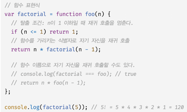 - 함수 이름은 함수 몸체 내부에서만 유효하기 때문에 함수 내부에서 함수 이름을 사용해 자기 자신 호출 가능