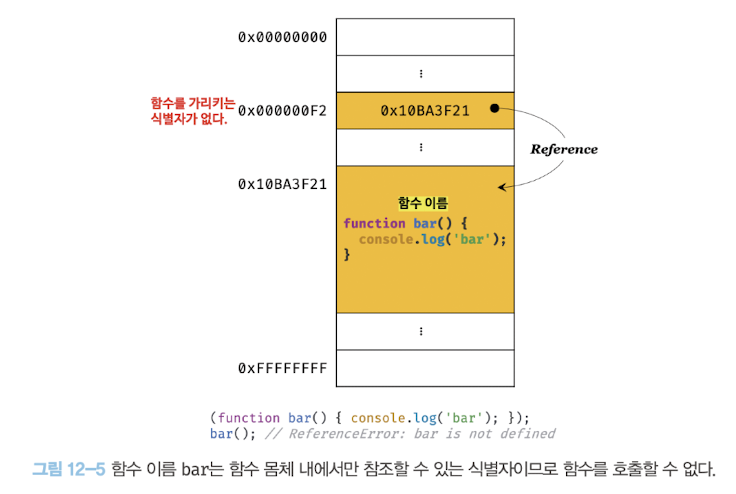 - 함수 이름은 함수 몸체 내에서만 참조할 수 있는 식별자기때문에 함수 외부에서는 함수이름으로 함수를 호출할 수 없음
