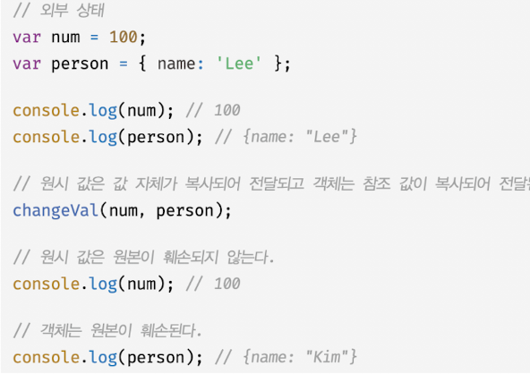 - 값 자체가 복사되어 매개변수에 전달되기 때문에 함수 내부에서 재할당하더라도 원본 훼손되지 않음