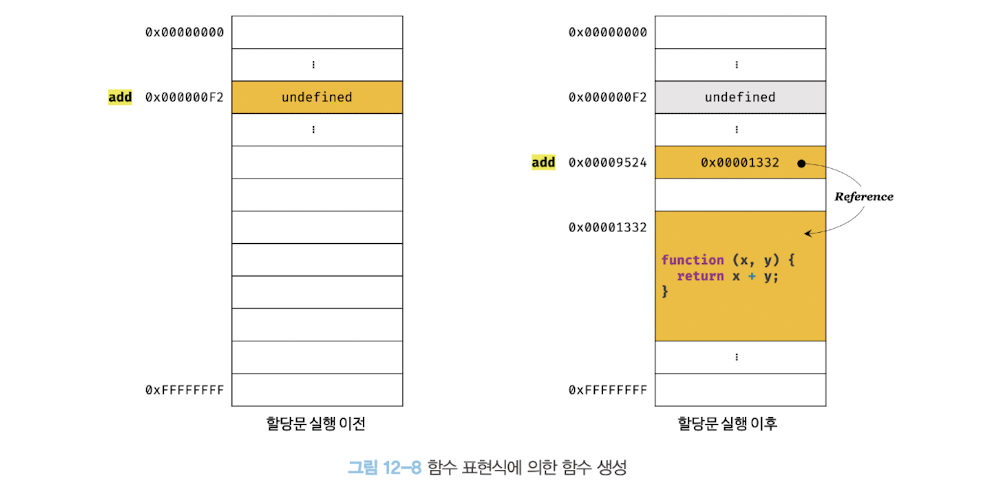 - 변수 할당문은 런타임에 평가되어 할당문이 실행되는 시점에 함수 객체 할당