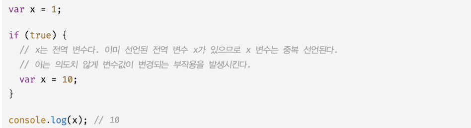 - 함수 레벨 스코프는 전역 변수 남발 가능성 ↑ => 의도치 않게 전역 변수 중복 선언