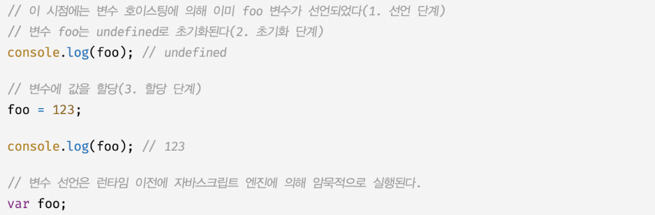- 런타임 이전에 자바스크립트 엔진에 의해 암묵적으로 선언 단계가 먼저 실행되지만 초기화 단계는 변수 선언문 도달했을 때 실행