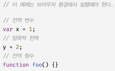 - var 선언 전역변수와 전역함수, 선언하지 않은 변수에 값을 할당한 암묵적 전역은 전역 객체 window 프로퍼티