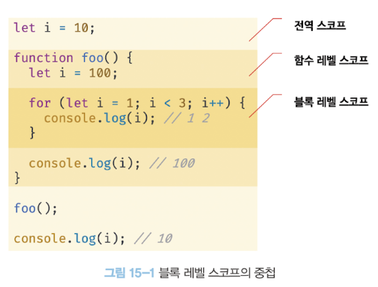 - let은 모든 코드 블록(함수, if문, for문, while문, try/catch문 등)을 지역 스코프로 인정하는 블록 레벨스코프를 따름