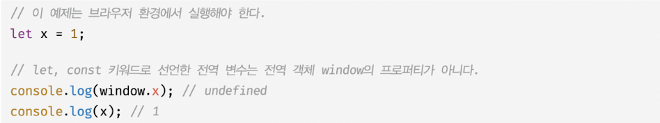 - let 선언 전역변수는 전역 객체의 프로퍼티가 아님