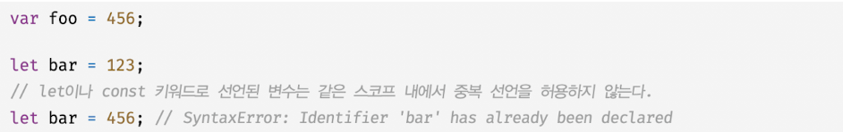 - let 키워드로 이름이 같은 변수를 중복 선언하면 문법 에러 발생