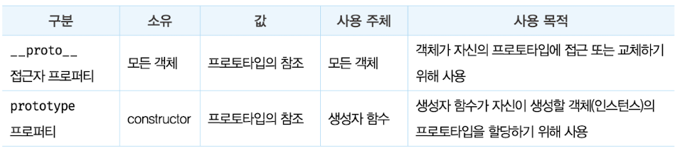 - 모든 객체가 가지고 있는(Object.prototype으로부터 상속받은) __proto__ 접근자 프로퍼티와 함수 객체만이 가지고 있는 prototype 프로퍼티는 결국 동일한 프로토타입을 가리킴 하지만 프로퍼티를 사용하는 주체가 다름
