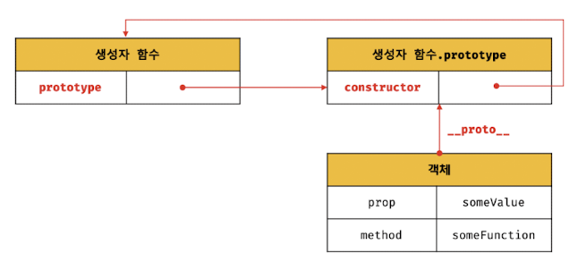 - 모든 객체는 하나의 프로토타입을 갖고 있고 모든 프로토타입은 생성자 함수와 연결되어 있음
