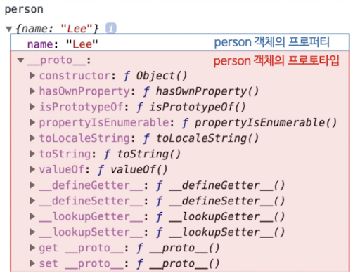 - __proto__ 접근자 프로퍼티를 통해 person 객체의 [[Prototype]] 내부 슬롯이 가리키는 객체인 Object.prototype에 접근한 결과를 크롬 브라우저가 콘솔에 표시한 것