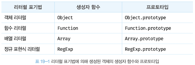 - 객체 리터럴에 의해 생성된 객체의 프로토타입은 Object.prototype이고 생성자 함수에 의해 생성된 객체의 프로토타입은 생성자 함수의 prototype 프로퍼티에 바인딩되어있는 객체