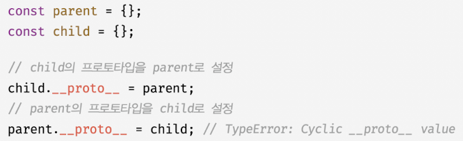 - 서로가 자신의 프로토타입이 되는 비정상적인 프로토타입 체인이 만들어지면 __proto__ 접근자 프로퍼티는 에러 발생