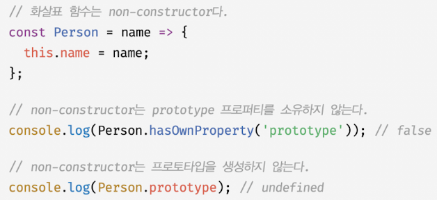 - 생성자 함수로서 호출할 수 없는 함수인 non-constructor인 화살표함수와 ES6 메서드 축약 표현으로 정의한 메서드는 prototype 프로퍼티를 소유하지 않으며 프로토타입도 생성하지 않음