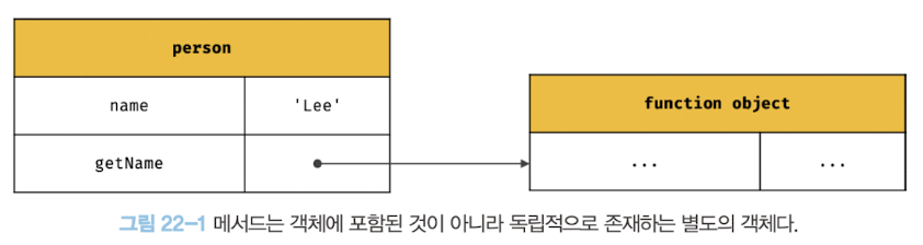 메서드는 프로퍼티에 바인딩된 함수로 person 객체의 getName 프로퍼티가 가리키는 함수 객체는 person 객체에 포함된 것이 아니라 독립적으로 존재하는 별도의 객체