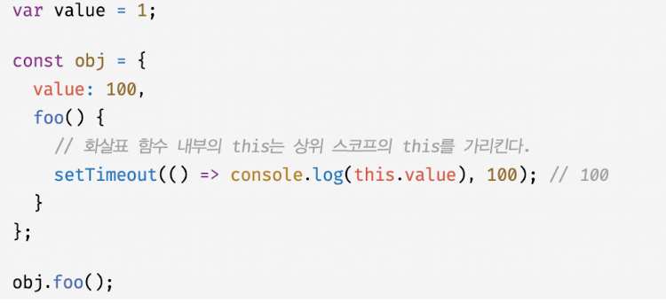 - 하지만 외부 함수인 메서드와 중첩 함수 또는 콜백 함수의 this가 일치하지 않는다는 것은 중첩함수 또는 콜백함수를 헬퍼 함수로 동작하기 어렵게 만듦