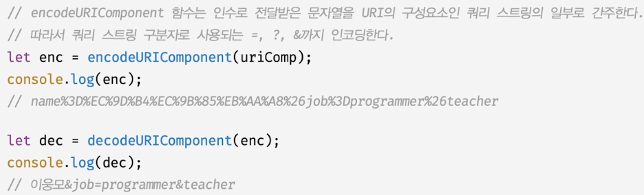 - encodeURIComponent 함수는 인수로 전달된 문자열을 URI의 구성요소인 쿼리 스트링의 일부로 간주