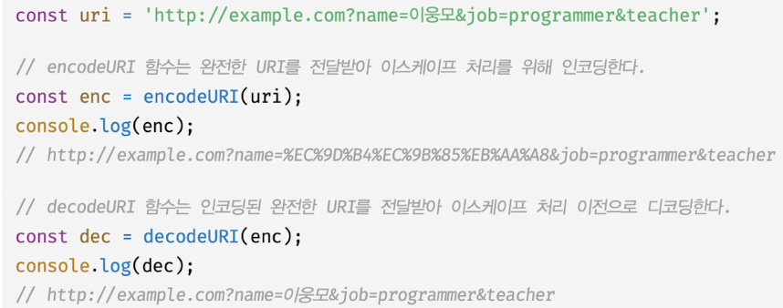 - encodeURI 함수는 완전한 URL를 문자열로 전달받아 이스케이프 처리를 위해 인코딩