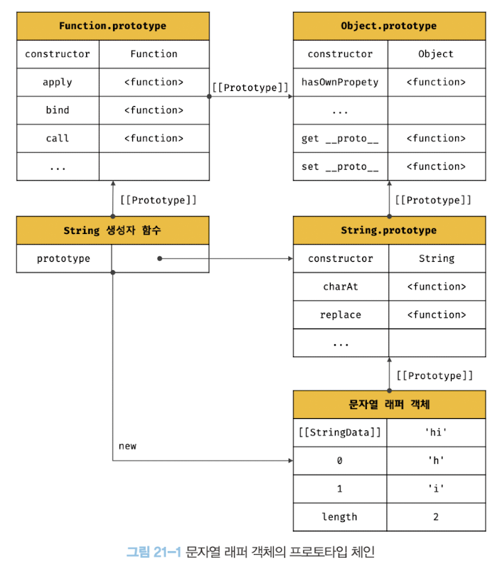 - 문자열에 대해 마침표 표기법으로 접근하면 그 순간 래퍼 객체인 String 생성자 함수의 인스턴스 생성되고 문자열은 래퍼 객체의 [[StringData]] 내부 슬롯에 할당