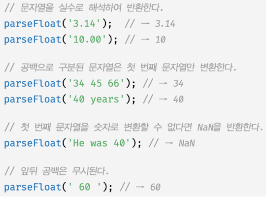- 전달받은 문자열 인수를 부동 소수점 숫자, 실수로 해석해 반환