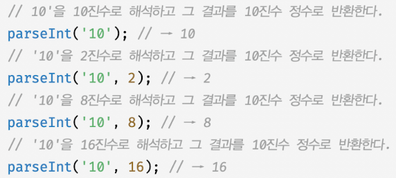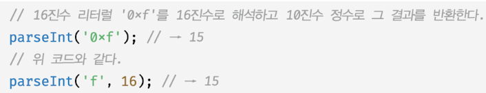 - 두번째 인수로 진법을 나타내는 기수를 지정하지 않더라도 첫번째 인수로 전달된 문자열이 "0x" 또는 "OX"로 시작하는 16진수 리터럴이라면 16진수로 해석하여 10진수 정수로 반환