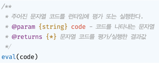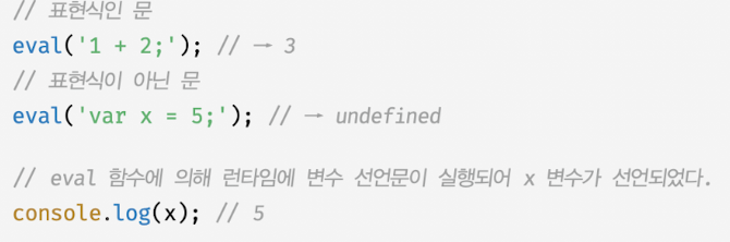 - 전달 받은 문자열 코드가 표현식 ✕ -> 문자열 코드를 런타임에 실행