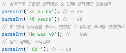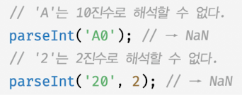 - 하지만 첫번째 인수로 전달한 문자열의 두번재 문자부터 해당 진수를 나타내는 숫자가 아닌문자와 마주치면 이 문자와 계속되는 문자들은 전부 무시되며 해석된 정수값만 반환