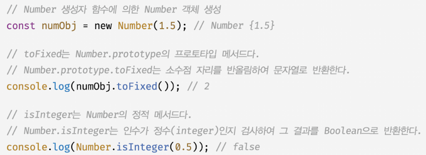 - 표준 빌트인 객체인 Number는 인스턴스 없이 정적으로 호출 할 수 있는 정적 메서드 제공
