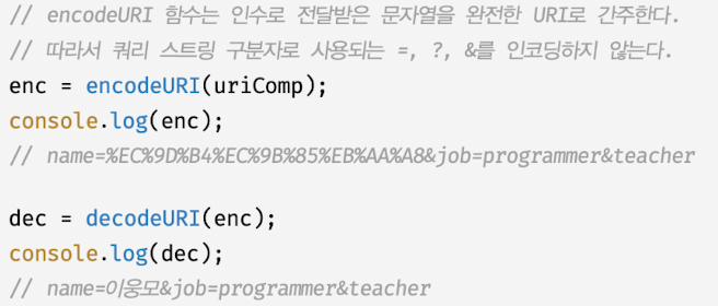 - encodeURIComponent 함수는 인수로 전달된 문자열을 URI의 구성요소인 쿼리 스트링의 일부로 간주
