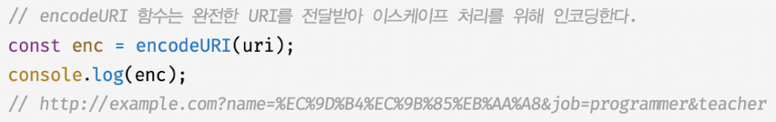 - encodeURI 함수는 완전한 URL를 문자열로 전달받아 이스케이프 처리를 위해 인코딩