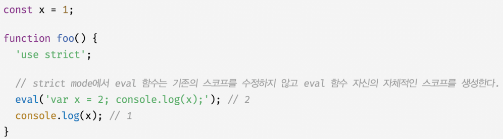 - 단, strict mode에서 eval 함수는 기존의 스코프를 수정하지 않고 eval 함수 자신의 자체 스코프 생성