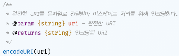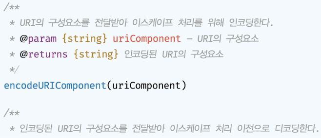 - encodeURIComponent 함수는 URI 구성 요소를 인수로 전달받아 인코딩